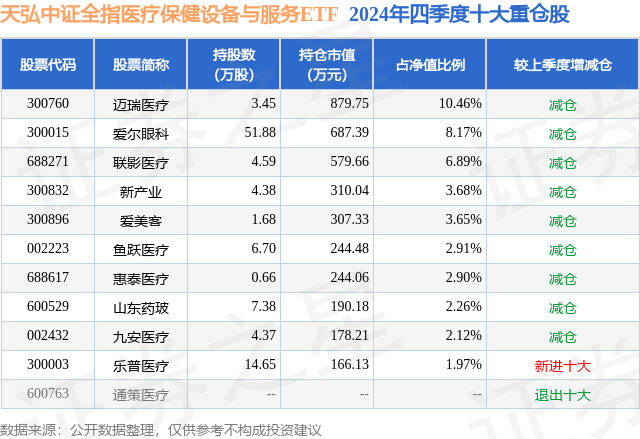 从基金规模来看,天弘中证全指医疗保健设备与服务ETF基金2024年四季度公布的基金规模为0.84亿元,较上一期规模1.47亿元变化了-6249.8万元,环比变化了-42.62%。该基金最新一期资产配置为:股票占净值比99.15%,无债券类资产,现金占净值比0.98%。从基金持仓来看,该基金当季前十大股票仓位达45.01%,第一大重仓股为迈瑞医疗(300760),持仓占比为10.46%。