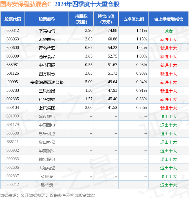 从基金规模来看,国寿安保稳弘混合C基金2024年四季度公布的基金规模为0.2亿元,较上一期规模2104.09万元变化了-110.61万元,环比变化了-5.26%。该基金最新一期资产配置为:股票占净值比10.79%,债券占净值比43.1%,现金占净值比12.64%。从基金持仓来看,该基金当季前十大股票仓位达10.03%,第一大重仓股为平高电气(600312),持仓占比为1.41%。