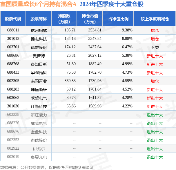 从基金规模来看,富国质量成长6个月持有混合A基金2024年四季度公布的基金规模为3.62亿元,较上一期规模3.64亿元变化了-222.06万元,环比变化了-0.61%。该基金最新一期资产配置为:股票占净值比92.95%,无债券类资产,现金占净值比7.66%。从基金持仓来看,该基金当季前十大股票仓位达57.44%,第一大重仓股为杭州柯林(688611),持仓占比为9.38%。
