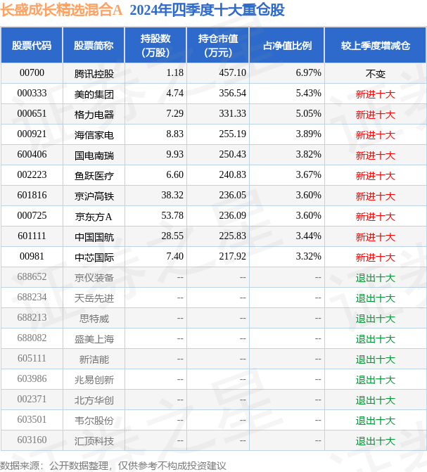 从基金规模来看,长盛成长精选混合A基金2024年四季度公布的基金规模为0.61亿元,较上一期规模5664.87万元变化了403.08万元,环比变化了7.12%。该基金最新一期资产配置为:股票占净值比93.87%,无债券类资产,现金占净值比6.27%。从基金持仓来看,该基金当季前十大股票仓位达42.79%,第一大重仓股为腾讯控股(00700),持仓占比为6.97%。