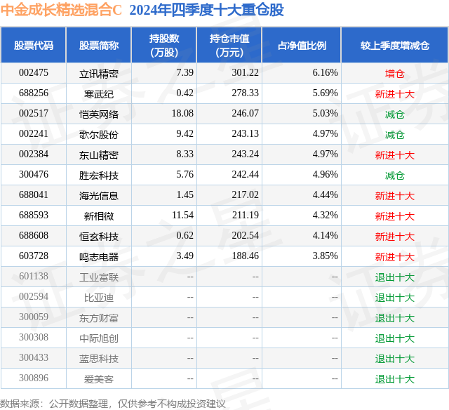 证券之星消息,日前中金成长精选混合C基金公布四季报,2024年四季度最新规模0.18亿元,季度净值涨幅为-1.09%。