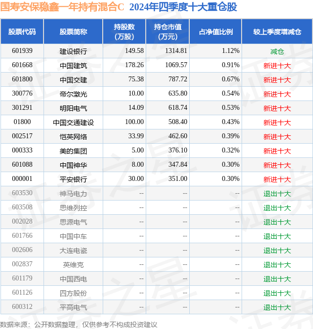 从基金规模来看,国寿安保稳鑫一年持有混合C基金2024年四季度公布的基金规模为0.78亿元,较上一期规模8626.28万元变化了-777.83万元,环比变化了-9.02%。该基金最新一期资产配置为:股票占净值比13.37%,债券占净值比80.48%,现金占净值比2.14%。从基金持仓来看,该基金当季前十大股票仓位达5.51%,第一大重仓股为建设银行(601939),持仓占比为1.12%。