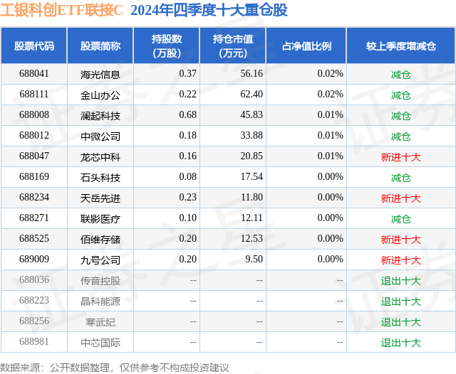 从基金规模来看,工银科创ETF联接C基金2024年四季度公布的基金规模为19.41亿元,较上一期规模12.07亿元变化了7.34亿元,环比变化了60.82%。该基金最新一期资产配置为:股票占净值比0.12%,无债券类资产,现金占净值比5.95%。从基金持仓来看,该基金当季前十大股票仓位达0.07%,第一大重仓股为海光信息(688041),持仓占比为0.02%。