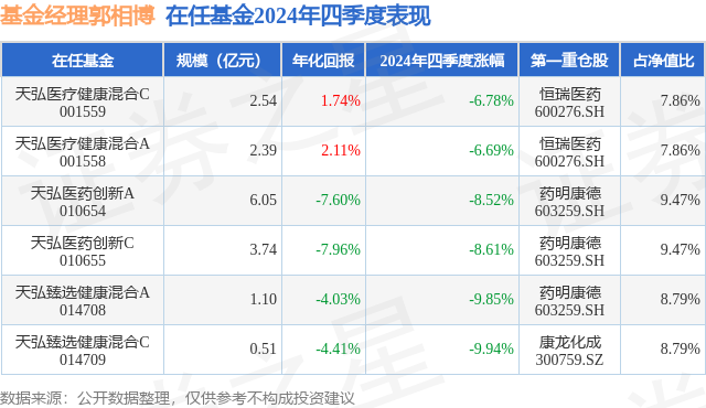 天弘医药创新A现任基金经理为郭相博。其中在任基金经理郭相博已从业7年又8天,2020年12月2日正式接手管理天弘医药创新A,任职期间累计回报为-27.78%。目前还管理着6只基金产品(包括A类和C类)。
