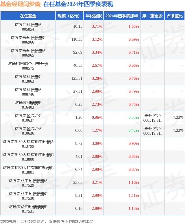 证券之星消息,日前财通安盈混合C基金公布四季报,2024年四季度最新规模1.2亿元,季度净值涨幅为-0.53%。