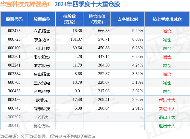 从基金规模来看,华宝科技先锋混合C基金2024年四季度公布的基金规模为0.22亿元,较上一期规模2400.55万元变化了-179.18万元,环比变化了-7.46%。该基金最新一期资产配置为:股票占净值比94.39%,无债券类资产,现金占净值比6.58%。从基金持仓来看,该基金当季前十大股票仓位达49.62%,第一大重仓股为立讯精密(002475),持仓占比为9.29%。