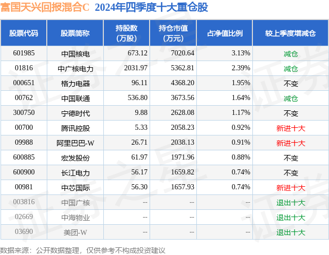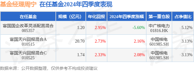 从基金规模来看,富国天兴回报混合C基金2024年四季度公布的基金规模为1.74亿元,较上一期规模9001.64万元变化了8428.83万元,环比变化了93.64%。该基金最新一期资产配置为:股票占净值比25.69%,债券占净值比110.3%,现金占净值比2.42%。从基金持仓来看,该基金当季前十大股票仓位达14.47%,第一大重仓股为中国核电(601985),持仓占比为3.13%。