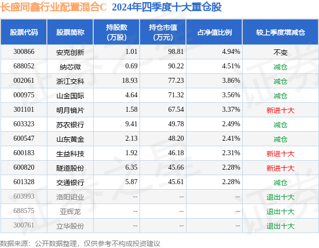 证券之星消息,日前长盛同鑫行业配置混合C基金公布四季报,2024年四季度最新规模0.01亿元,季度净值涨幅为-2.25%。