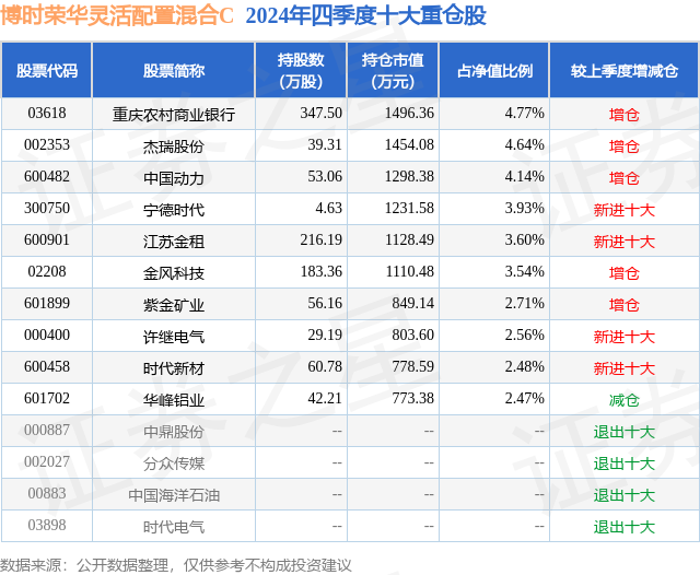 从基金规模来看,博时荣华灵活配置混合C基金2024年四季度公布的基金规模为0.11亿元,较上一期规模1114.19万元变化了-17.85万元,环比变化了-1.6%。该基金最新一期资产配置为:股票占净值比84.18%,债券占净值比2.68%,现金占净值比9.63%。从基金持仓来看,该基金当季前十大股票仓位达34.84%,第一大重仓股为重庆农村商业银行(03618),持仓占比为4.77%。
