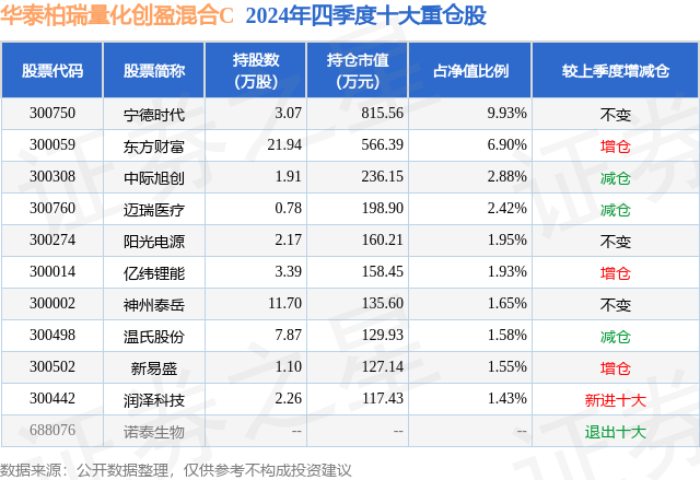 从基金规模来看,华泰柏瑞量化创盈混合C基金2024年四季度公布的基金规模为0.25亿元,较上一期规模2500.22万元变化了-44.96万元,环比变化了-1.8%。该基金最新一期资产配置为:股票占净值比93.84%,债券占净值比3.09%,现金占净值比3.41%。从基金持仓来看,该基金当季前十大股票仓位达32.22%,第一大重仓股为宁德时代(300750),持仓占比为9.93%。
