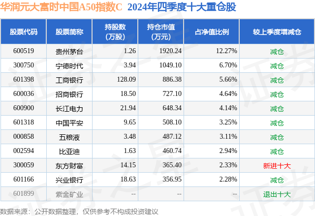 从基金规模来看,华润元大富时中国A50指数C基金2024年四季度公布的基金规模为0.02亿元,较上一期规模258.1万元变化了-56.85万元,环比变化了-22.03%。该基金最新一期资产配置为:股票占净值比94.99%,债券占净值比5.11%,现金占净值比2.59%。从基金持仓来看,该基金当季前十大股票仓位达47.32%,第一大重仓股为贵州茅台(600519),持仓占比为12.27%。