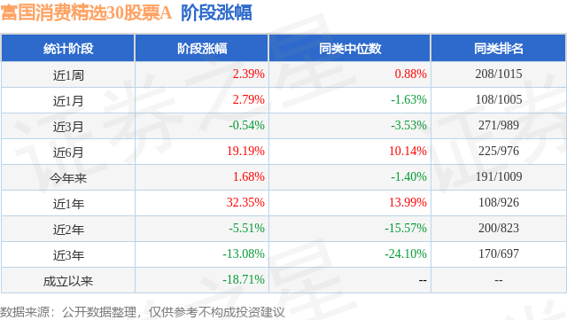 从业绩表现来看,富国消费精选30股票A基金过去一年净值涨幅为32.35%,在同类基金中排名108/926,同类基金过去一年净值涨幅中位数为13.99%。而基金过去一年的最大回撤为-16.28%,成立以来的最大回撤为-44.81%。