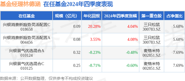 兴银景气优选混合A现任基金经理为林德涵。其中在任基金经理林德涵已从业3年又253天,2023年10月18日正式接手管理兴银景气优选混合A,任职期间累计回报为3.96%。目前还管理着4只基金产品(包括A类和C类),其中本季度表现最佳的基金为兴银消费新趋势灵活配置A(004456),季度净值涨幅为4.08%。