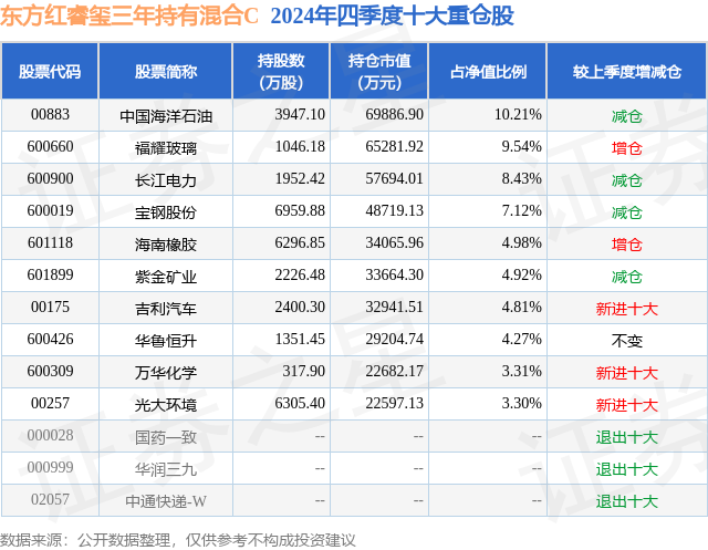 从基金规模来看,东方红睿玺三年持有混合C基金2024年四季度公布的基金规模为0.18亿元,较上一期规模1998.09万元变化了-237.09万元,环比变化了-11.87%。该基金最新一期资产配置为:股票占净值比82.29%,无债券类资产,现金占净值比16.17%。从基金持仓来看,该基金当季前十大股票仓位达60.89%,第一大重仓股为中国海洋石油(00883),持仓占比为10.21%。