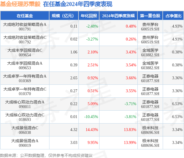 大成丰享回报混合C现任基金经理为苏秉毅。其中在任基金经理苏秉毅已从业12年又353天,2024年1月29日正式接手管理大成丰享回报混合C,任职期间累计回报为8.37%。目前还管理着10只基金产品(包括A类和C类),其中本季度表现最佳的基金为大成景恒混合A(090019),季度净值涨幅为13.99%。