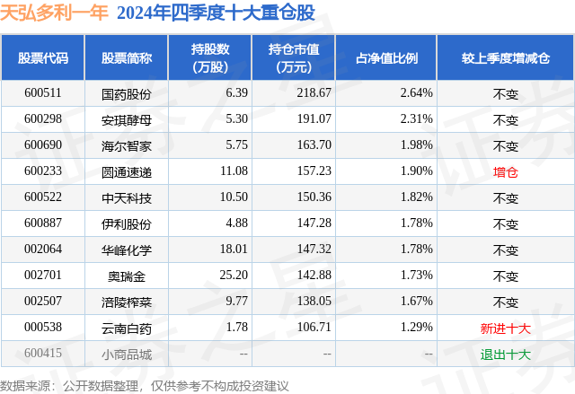 从基金规模来看,天弘多利一年基金2024年四季度公布的基金规模为0.83亿元,较上一期规模8136.38万元变化了132.13万元,环比变化了1.62%。该基金最新一期资产配置为:股票占净值比28.0%,债券占净值比84.07%,现金占净值比5.11%。从基金持仓来看,该基金当季前十大股票仓位达18.9%,第一大重仓股为国药股份(600511),持仓占比为2.64%。