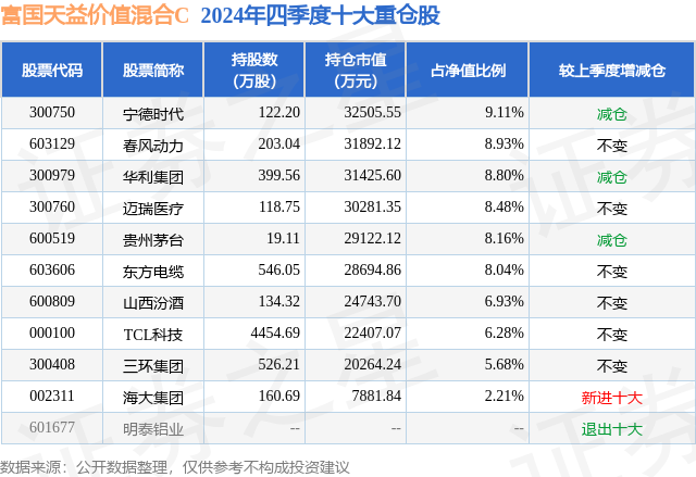 证券之星消息,日前富国天益价值混合C基金公布四季报,2024年四季度最新规模0.29亿元,季度净值涨幅为-7.31%。