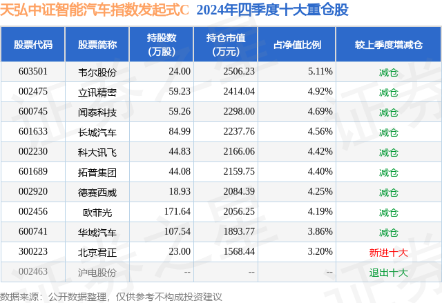 从基金规模来看,天弘中证智能汽车指数发起式C基金2024年四季度公布的基金规模为3.82亿元,较上一期规模4.63亿元变化了-8100.42万元,环比变化了-17.49%。该基金最新一期资产配置为:股票占净值比94.66%,无债券类资产,现金占净值比5.97%。从基金持仓来看,该基金当季前十大股票仓位达43.6%,第一大重仓股为韦尔股份(603501),持仓占比为5.11%。