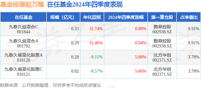 从基金规模来看,九泰久福量化股票A基金2024年四季度公布的基金规模为0.28亿元,较上一期规模2733.26万元变化了113.27万元,环比变化了4.14%。该基金最新一期资产配置为:股票占净值比89.02%,无债券类资产,现金占净值比11.29%。从基金持仓来看,该基金当季前十大股票仓位达30.9%,第一大重仓股为北方华创(002371),持仓占比为3.78%。