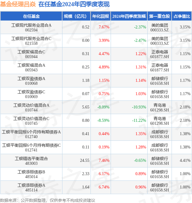 从基金规模来看,工银灵动价值混合A基金2024年四季度公布的基金规模为5.65亿元,较上一期规模7.16亿元变化了-1.51亿元,环比变化了-21.1%。该基金最新一期资产配置为:股票占净值比71.81%,无债券类资产,现金占净值比28.85%。从基金持仓来看,该基金当季前十大股票仓位达21.04%,第一大重仓股为青岛港(601298),持仓占比为2.18%。