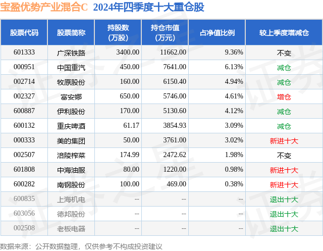 从基金规模来看,宝盈优势产业混合C基金2024年四季度公布的基金规模为3.7亿元,较上一期规模4.34亿元变化了-6350.34万元,环比变化了-14.64%。该基金最新一期资产配置为:股票占净值比38.66%,无债券类资产,现金占净值比62.03%。从基金持仓来看,该基金当季前十大股票仓位达38.61%,第一大重仓股为广深铁路(601333),持仓占比为9.36%。