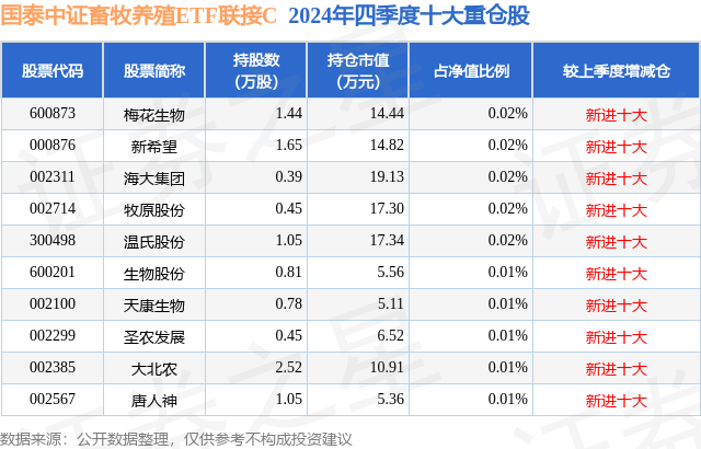 从基金规模来看,国泰中证畜牧养殖ETF联接C基金2024年四季度公布的基金规模为6.97亿元,较上一期规模9.11亿元变化了-2.14亿元,环比变化了-23.51%。该基金最新一期资产配置为:股票占净值比0.18%,无债券类资产,现金占净值比6.56%。从基金持仓来看,该基金当季前十大股票仓位达0.15%,第一大重仓股为梅花生物(600873),持仓占比为0.02%。