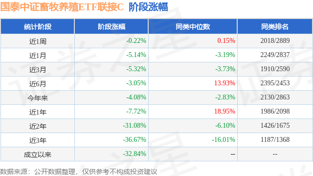 从业绩表现来看,国泰中证畜牧养殖ETF联接C基金过去一年净值涨幅为-7.72%,在同类基金中排名1986/2098,同类基金过去一年净值涨幅中位数为18.95%。而基金过去一年的最大回撤为-29.18%,成立以来的最大回撤为-48.06%。