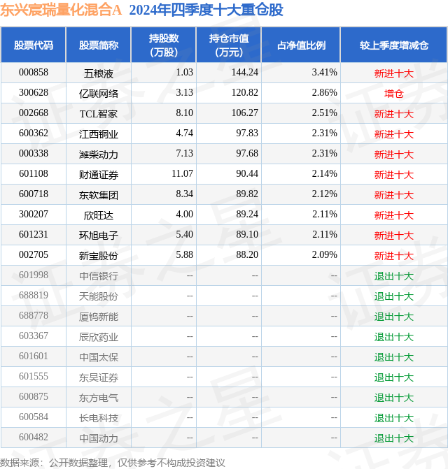 证券之星消息,日前东兴宸瑞量化混合A基金公布四季报,2024年四季度最新规模0.28亿元,季度净值涨幅为0.84%。