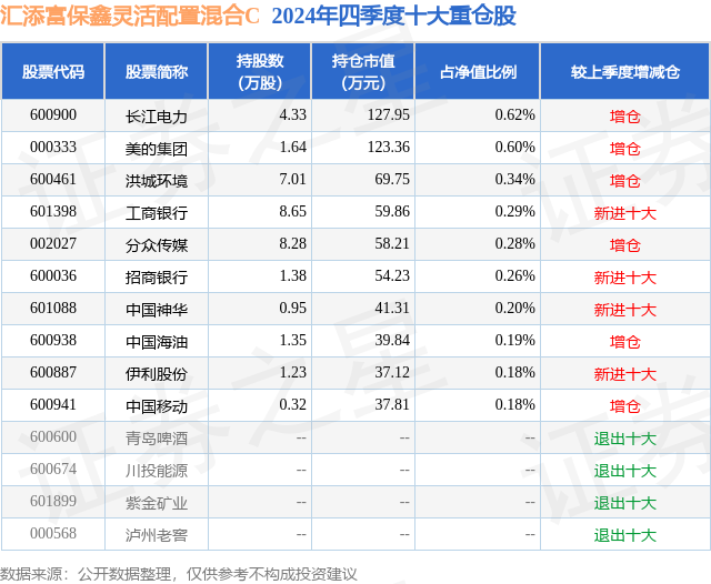 从基金规模来看,汇添富保鑫灵活配置混合C基金2024年四季度公布的基金规模为1.55亿元,较上一期规模115.1万元变化了1.54亿元,环比变化了13367.49%。该基金最新一期资产配置为:股票占净值比5.44%,债券占净值比98.91%,现金占净值比1.08%。从基金持仓来看,该基金当季前十大股票仓位达3.14%,第一大重仓股为长江电力(600900),持仓占比为0.62%。