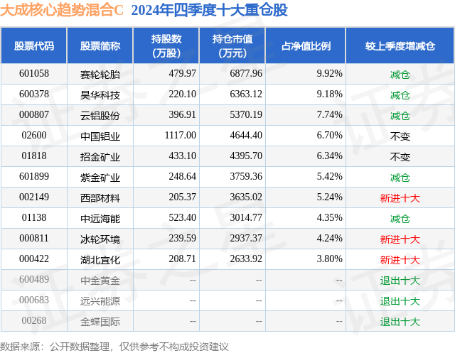 从基金规模来看,大成核心趋势混合C基金2024年四季度公布的基金规模为1.33亿元,较上一期规模1.67亿元变化了-3400.42万元,环比变化了-20.31%。该基金最新一期资产配置为:股票占净值比93.62%,无债券类资产,现金占净值比8.39%。从基金持仓来看,该基金当季前十大股票仓位达62.93%,第一大重仓股为赛轮轮胎(601058),持仓占比为9.92%。
