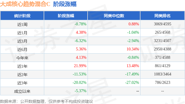 从业绩表现来看,大成核心趋势混合C基金过去一年净值涨幅为21.99%,在同类基金中排名861/4129,同类基金过去一年净值涨幅中位数为13.48%。而基金过去一年的最大回撤为-24.07%,成立以来的最大回撤为-42.85%。