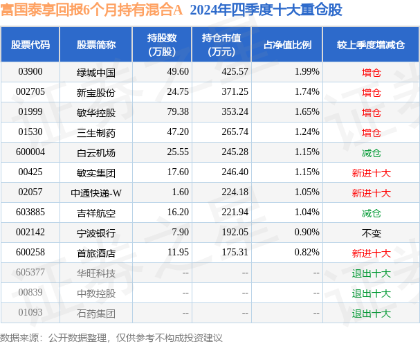 证券之星消息,日前富国泰享回报6个月持有混合A基金公布四季报,2024年四季度最新规模2.12亿元,季度净值涨幅为0.12%。
