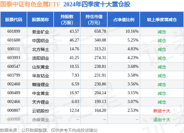 从基金规模来看,国泰中证有色金属ETF基金2024年四季度公布的基金规模为0.65亿元,较上一期规模8802.08万元变化了-2318.81万元,环比变化了-26.34%。该基金最新一期资产配置为:股票占净值比99.31%,无债券类资产,现金占净值比0.81%。从基金持仓来看,该基金当季前十大股票仓位达44.04%,第一大重仓股为紫金矿业(601899),持仓占比为10.16%。