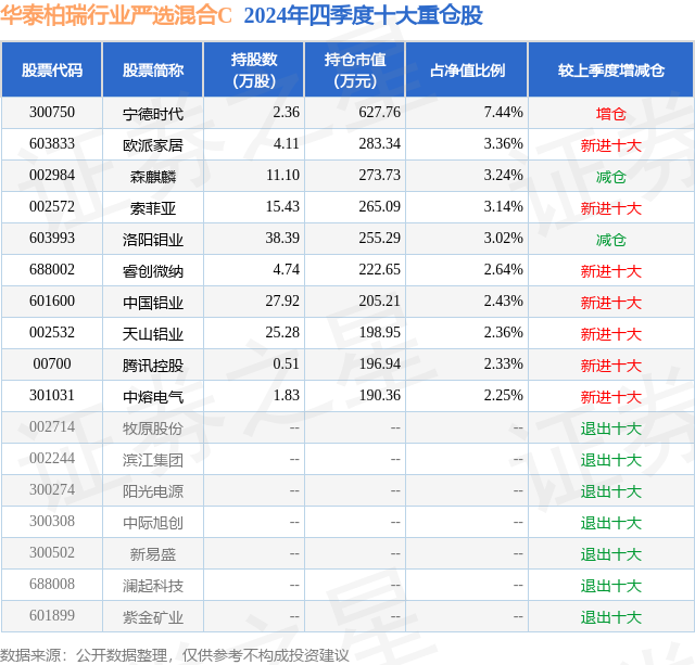 从基金规模来看,华泰柏瑞行业严选混合C基金2024年四季度公布的基金规模为0.1亿元,较上一期规模1206.82万元变化了-167.29万元,环比变化了-13.86%。该基金最新一期资产配置为:股票占净值比92.18%,无债券类资产,现金占净值比8.23%。从基金持仓来看,该基金当季前十大股票仓位达32.21%,第一大重仓股为宁德时代(300750),持仓占比为7.44%。