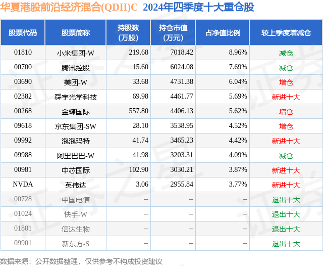 从基金规模来看,华夏港股前沿经济混合(QDII)C基金2024年四季度公布的基金规模为0.27亿元,较上一期规模3055.67万元变化了-383.39万元,环比变化了-12.55%。该基金最新一期资产配置为:股票占净值比90.77%,债券占净值比0.49%,现金占净值比7.92%。从基金持仓来看,该基金当季前十大股票仓位达54.67%,第一大重仓股为小米集团-W(01810),持仓占比为8.96%。