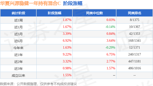从业绩表现来看,华夏兴源稳健一年持有混合C基金过去一年净值涨幅为9.22%,在同类基金中排名240/1317,同类基金过去一年净值涨幅中位数为6.75%。而基金过去一年的最大回撤为-4.94%,成立以来的最大回撤为-11.73%。