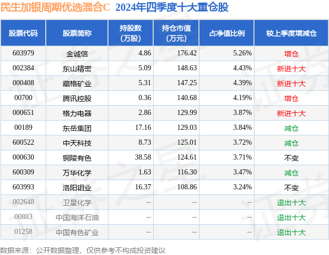 从基金规模来看,民生加银周期优选混合C基金2024年四季度公布的基金规模为0.06亿元,较上一期规模711.34万元变化了-63.77万元,环比变化了-8.96%。该基金最新一期资产配置为:股票占净值比81.98%,无债券类资产,现金占净值比20.21%。从基金持仓来看,该基金当季前十大股票仓位达40.12%,第一大重仓股为金诚信(603979),持仓占比为5.26%。