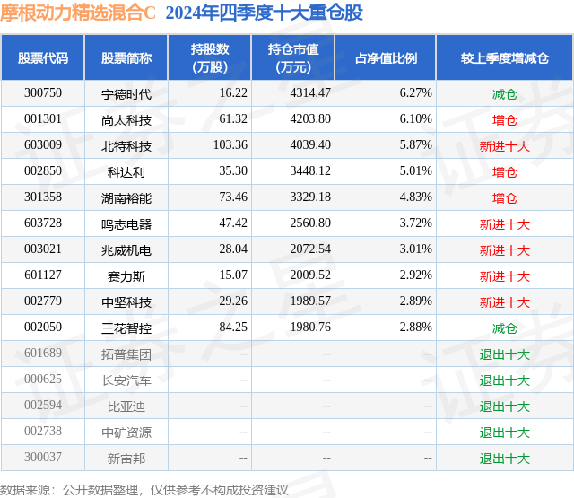 从基金规模来看,摩根动力精选混合C基金2024年四季度公布的基金规模为0.76亿元,较上一期规模1.52亿元变化了-7522.34万元,环比变化了-49.58%。该基金最新一期资产配置为:股票占净值比92.44%,无债券类资产,现金占净值比8.58%。从基金持仓来看,该基金当季前十大股票仓位达43.5%,第一大重仓股为宁德时代(300750),持仓占比为6.27%。