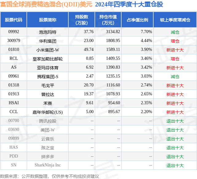 从基金规模来看,富国全球消费精选混合(QDII)美元基金2024年四季度公布的基金规模为2.76亿元,较上一期规模3.56亿元变化了-8027.46万元,环比变化了-22.54%。该基金最新一期资产配置为:股票占净值比76.72%,无债券类资产,现金占净值比32.89%。从基金持仓来看,该基金当季前十大股票仓位达35.89%,第一大重仓股为泡泡玛特(09992),持仓占比为7.7%。