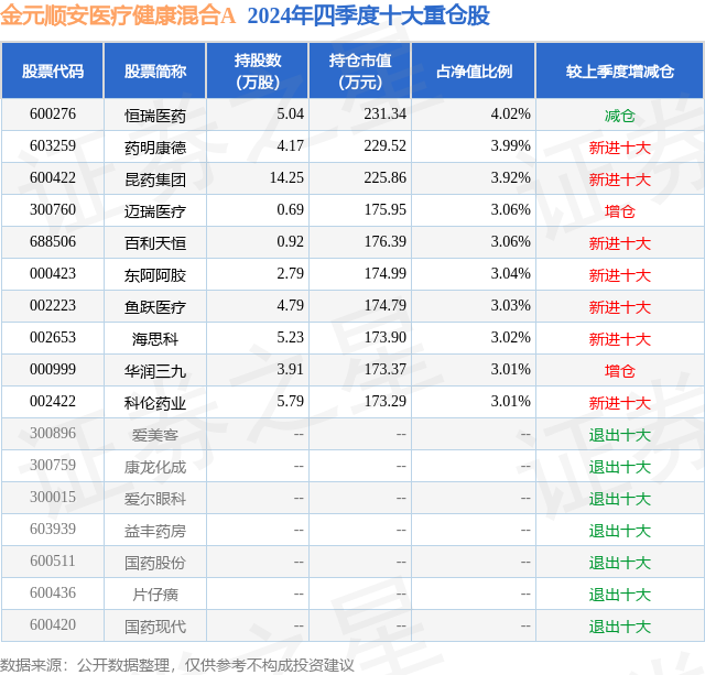 证券之星消息,日前金元顺安医疗健康混合A基金公布四季报,2024年四季度最新规模0.29亿元,季度净值涨幅为-12.01%。