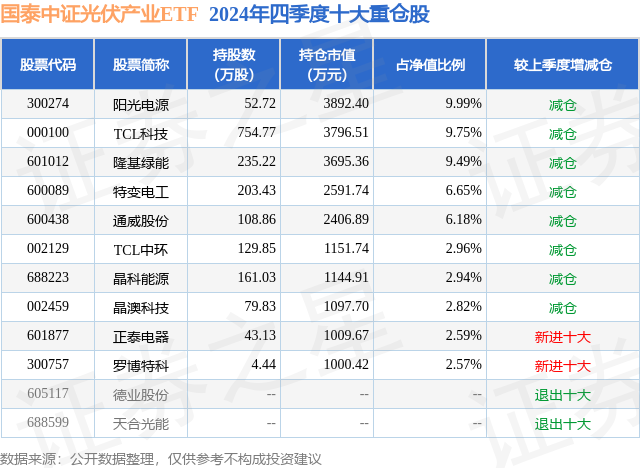 从基金规模来看,国泰中证光伏产业ETF基金2024年四季度公布的基金规模为3.9亿元,较上一期规模4.33亿元变化了-4366.86万元,环比变化了-10.08%。该基金最新一期资产配置为:股票占净值比99.28%,无债券类资产,现金占净值比1.42%。从基金持仓来看,该基金当季前十大股票仓位达55.94%,第一大重仓股为阳光电源(300274),持仓占比为9.99%。