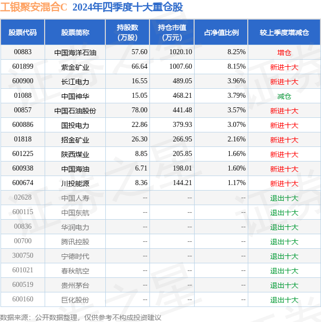 从基金规模来看,工银聚安混合C基金2024年四季度公布的基金规模为0.37亿元,较上一期规模749.17万元变化了2906.06万元,环比变化了387.91%。该基金最新一期资产配置为:股票占净值比39.8%,债券占净值比93.13%,现金占净值比3.21%。从基金持仓来看,该基金当季前十大股票仓位达37.38%,第一大重仓股为中国海洋石油(00883),持仓占比为8.25%。