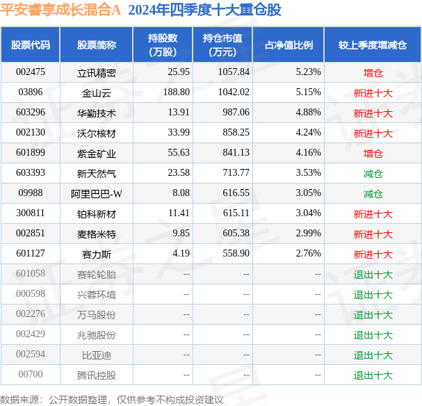 从基金规模来看,平安睿享成长混合A基金2024年四季度公布的基金规模为1.4亿元,较上一期规模1.39亿元变化了87.33万元,环比变化了0.63%。该基金最新一期资产配置为:股票占净值比93.53%,无债券类资产,现金占净值比7.84%。从基金持仓来看,该基金当季前十大股票仓位达39.03%,第一大重仓股为立讯精密(002475),持仓占比为5.23%。