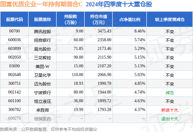 从基金规模来看,国富优质企业一年持有期混合C基金2024年四季度公布的基金规模为0.1亿元,较上一期规模1121.52万元变化了-169.04万元,环比变化了-15.07%。该基金最新一期资产配置为:股票占净值比92.95%,债券占净值比6.03%,现金占净值比2.52%。从基金持仓来看,该基金当季前十大股票仓位达53.39%,第一大重仓股为腾讯控股(00700),持仓占比为8.46%。