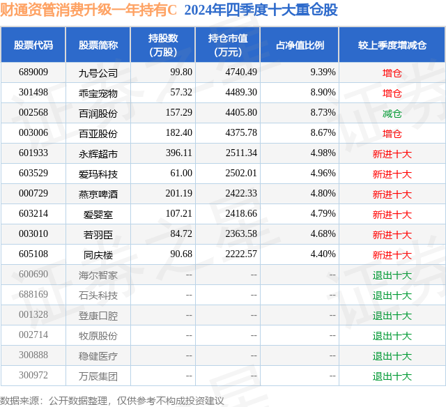 从基金规模来看,财通资管消费升级一年持有C基金2024年四季度公布的基金规模为0.24亿元,较上一期规模2386.0万元变化了14.63万元,环比变化了0.61%。该基金最新一期资产配置为:股票占净值比91.81%,无债券类资产,现金占净值比8.57%。从基金持仓来看,该基金当季前十大股票仓位达64.3%,第一大重仓股为九号公司(689009),持仓占比为9.39%。