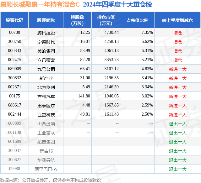 从基金规模来看,景顺长城融景一年持有混合C基金2024年四季度公布的基金规模为0.07亿元,较上一期规模824.86万元变化了-99.04万元,环比变化了-12.01%。该基金最新一期资产配置为:股票占净值比88.74%,无债券类资产,现金占净值比11.54%。从基金持仓来看,该基金当季前十大股票仓位达45.18%,第一大重仓股为腾讯控股(00700),持仓占比为7.35%。