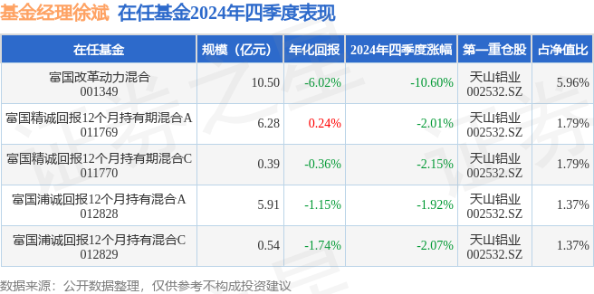 从基金规模来看,富国浦诚回报12个月持有混合A基金2024年四季度公布的基金规模为5.91亿元,较上一期规模6.45亿元变化了-5361.38万元,环比变化了-8.32%。该基金最新一期资产配置为:股票占净值比21.36%,债券占净值比61.48%,现金占净值比17.22%。从基金持仓来看,该基金当季前十大股票仓位达9.09%,第一大重仓股为天山铝业(002532),持仓占比为1.37%。