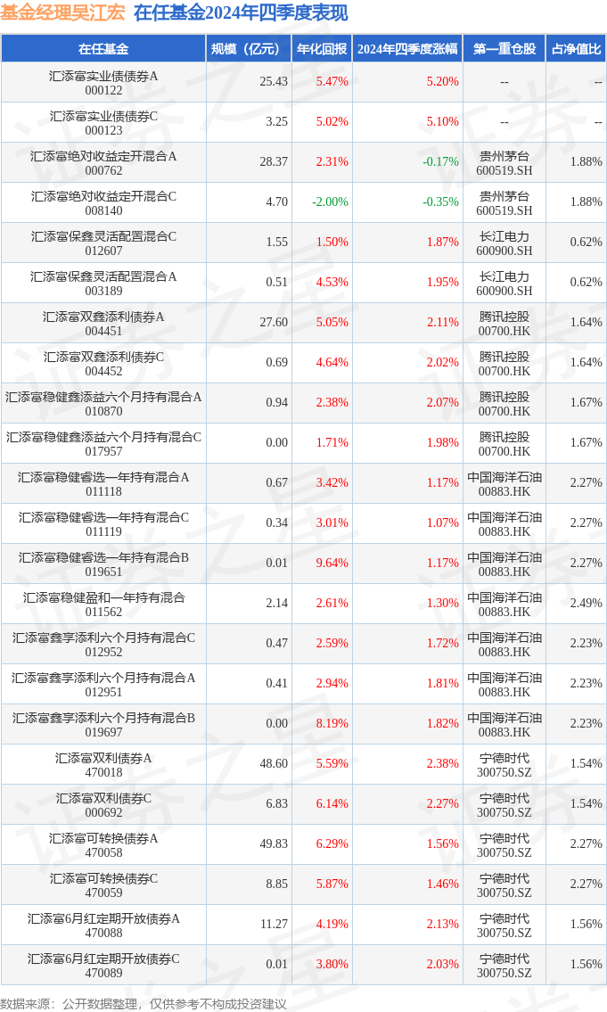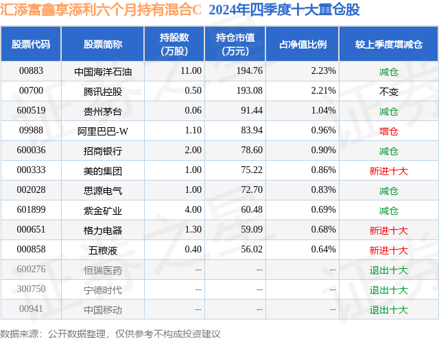 证券之星消息,日前汇添富鑫享添利六个月持有混合C基金公布四季报,2024年四季度最新规模0.47亿元,季度净值涨幅为1.72%。