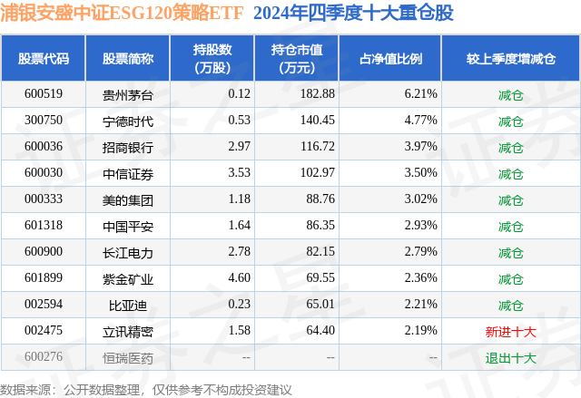 从基金规模来看,浦银安盛中证ESG120策略ETF基金2024年四季度公布的基金规模为0.29亿元,较上一期规模3564.77万元变化了-621.31万元,环比变化了-17.43%。该基金最新一期资产配置为:股票占净值比97.22%,无债券类资产,现金占净值比2.85%。从基金持仓来看,该基金当季前十大股票仓位达33.95%,第一大重仓股为贵州茅台(600519),持仓占比为6.21%。