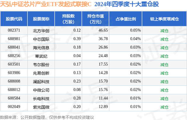从基金规模来看,天弘中证芯片产业ETF发起式联接C基金2024年四季度公布的基金规模为6.96亿元,较上一期规模6.93亿元变化了252.97万元,环比变化了0.36%。该基金最新一期资产配置为:股票占净值比0.44%,无债券类资产,现金占净值比8.42%。从基金持仓来看,该基金当季前十大股票仓位达0.25%,第一大重仓股为北方华创(002371),持仓占比为0.05%。